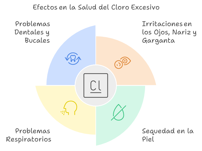 Unos niveles elevados de cloro no solo tienen efectos adversos en la salud de los bañistas, sino también en el mantenimiento de la piscina. El cloro en exceso puede causar: