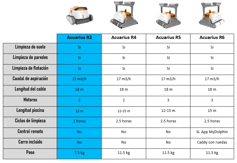 El limpiafondos Dolphin Acuarius R2 se caracteriza por su efectividad en la limpieza, por la calidad de sus componentes y por su fiabilidad. El Acuarius R2 pertenece a la gama de limpiafondos eléctricos y automáticos de Dolphin/Maytronics. Este modelo incorpora un diseño vanguardista y muy robusto, se encarga de la limpieza de la totalidad del vaso de la piscina y sortea de forma muy eficiente todos los obstáculos y formas. El Dolphin Acuarius R2 es ideal para piscinas de hasta 12 metros de longitud. Es muy práctico para el manejo por el particular y también es cómodo en cuanto al mantenimiento.