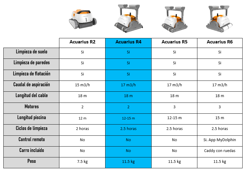 El Acuarius R4 pertenece a la gama de limpiafondos eléctricos para piscinas de la serie Dolphin de Maytronics. Este modelo dispone de un sistema de cepillo combinado para todo terreno que permitirá conseguir un resultado perfecto en cuanto a la limpieza del vaso de la piscina.