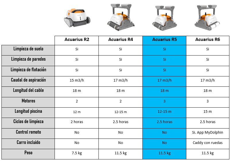 El Dolphin Acuarius R5 es un limpiafondos que incorpora un cable de 18 metros de longitud y tiene un caudal de aspiración de 17m3/hora. Dispone de un único ciclo de limpieza de 2,5 horas para una limpieza completa del vaso de la piscina (incluyendo paredes y línea de flotación además del suelo). Incluye un doble filtro de cartucho con filtros finos y ultrafinos para la captación de las partículas y deshechos más finos que se pueden depositar en el interior de la piscina (arenilla, polen, etc.).