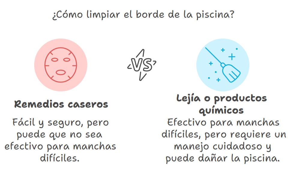 - Lejía o productos químicos: Si el borde está demasiado sucio o las manchas verdes están incrustadas, opta por productos más fuertes como la lejía. Aplica con cuidado, evitando que entre en contacto directo con el agua de la piscina.