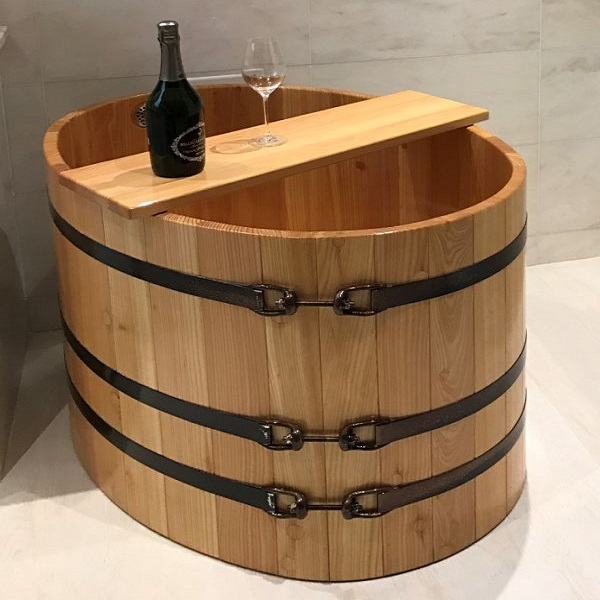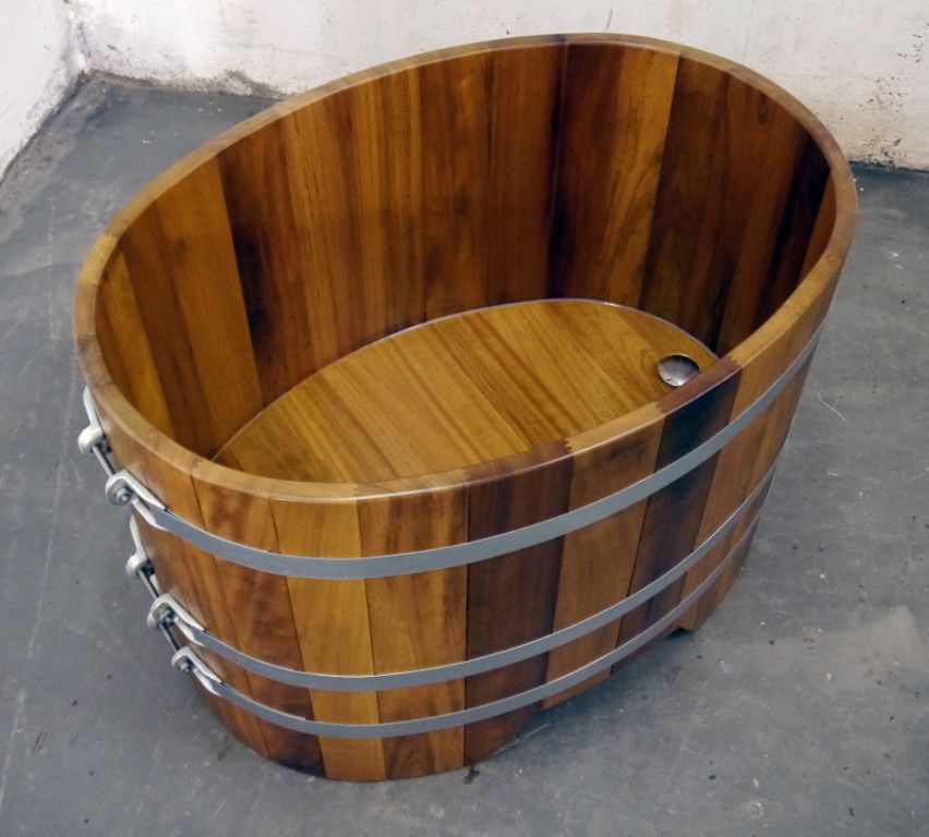Bañera de madera BWL 110 x 77 x 70(Alt) cm de alerce , con revestimiento transparente y sellado higiénico. Si se utiliza como bañera de ducha privada o publica.