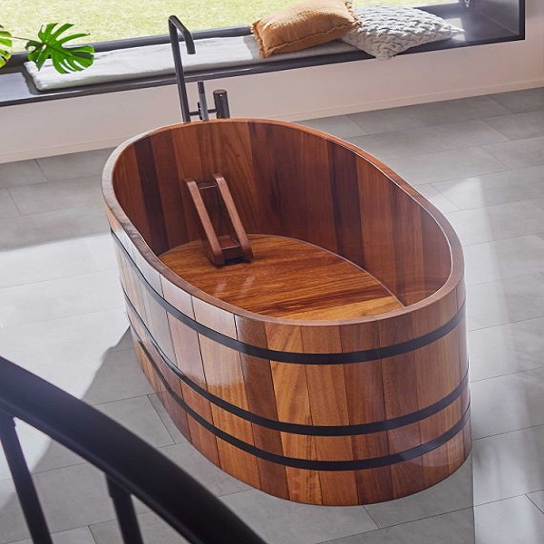 Bañera de madera BWL 161 x 79 x 70(Alt) cm de alerce , con revestimiento transparente y sellado higiénico. Si se utiliza como bañera de ducha privada o publica.