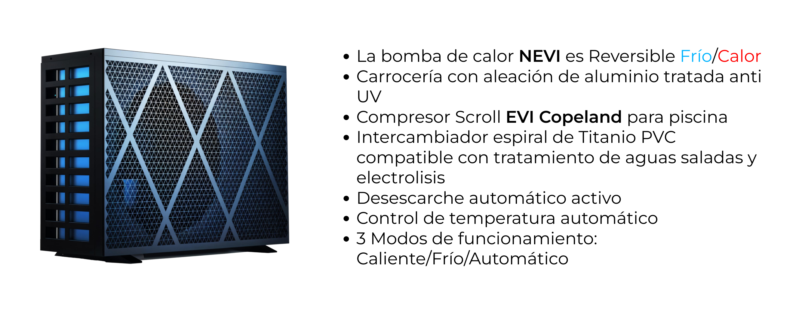 La Bomba de calor EVI se emplea para piscinas en lugares de mucho frío. Gracias a sus prestaciones y a su tecnología puede funcionar en climas extremos y de alta montaña. Su temperatura de funcionamiento es de hasta -25ºC y tiene una gran capacidad de restitución calorífica a bajas temperaturas.