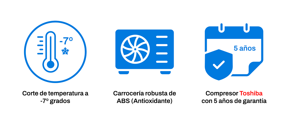 La Neoboost destaca por ser muy silenciosa disponiendo del modo de uso Silence que le permite trabajar sin apenas hacer ruido. Incluye los mejores componentes del mercado y ofrece las mayores garantías para una experiencia 100% satisfactoria. La Neoboost tiene incorporada una función de deshielo que le permite trabajar en cualquier momento del año pudiendo funcionar a partir de -7 grados de temperatura de aire exterior. Su carrocería está fabricada en ABS, es de diseño vanguardista, muy robusta y anticorrosiva/anti-U.V con una funda de Invierno completamente Gratis. Su compresor es de alto rendimiento de la marca TOSHIBA y ofrece 5 años de garantía*.
