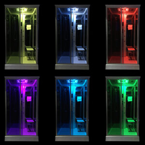 Las cabinas de ducha así como las cabinas de hidromasaje disponen de cromoterapia o terapia por colores, actúan sobre el equilibrio físico y mental. Este método integra una herramienta de anamnesia única, el test de los colores es revelador de estado del paciente. Tiene una acción directa sobre los órganos, las funciones metabólicas y/o sobre la relajación física y muscular. A nivel psicológico ayuda a gestionar, canalizar y armonizar las emociones, pero también a desarrollar la confianza en sí mismo, así como a luchar contra el estrés y la depresión. En cuanto a la cuestión mental permite mejorar la concentración, desarrollar la intuición, relajar el espíritu luchando contra la ansiedad y el insomnio. Cada color se define como una vibración luminosa especifica actuando sobre los órganos, las principales funciones fisiológicas, el metabolismo y la parte mental.