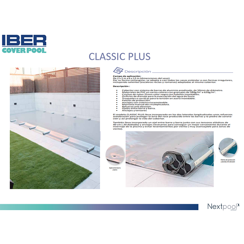La cubierta de barras de seguridad Classic Plus es perfecta para su empleo tanto en temporada como fuera de ella. Su facilidad tanto en su puesta como en su retirada hacen de ella una de las más prácticas y requeridas cubiertas que existen en el mercado de la piscina. Este tipo de cubierta de barras de seguridad se adapta a la normativa vigente en cuanto a seguridad en el espacio piscina. La cubierta de barras Classic plus pertenece a la categoría premium de las cubiertas de barras disponiendo de un sistema de protección mayor para la anti abrasión al colocarla y desenrollarla. Además de por si, su material es más denso ya que tiene 610gr/m2 en vez de 580gr/m2 como la mayoría de cubiertas de barras del mercado.