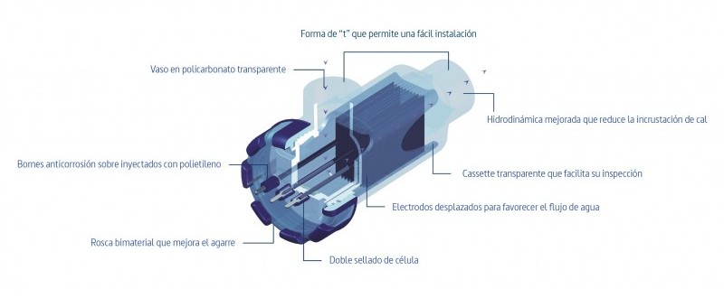 Equipado con célula hidrodinámica mejorada con una amplia superficie útil de los electrodos para menos adherencia de la cal.