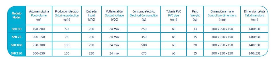 Producción mínima de cloro activo: 75g/h