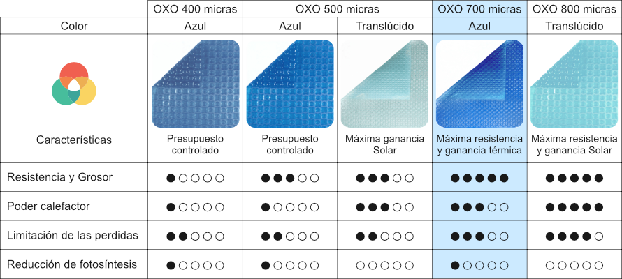 El cobertor OXO Optimal Blue Premium tiene una densidad de 700 micras y está fabricado con su novedosa tecnología con burbujas de forma alterna ( redondas y en forma de X ). Gracias a su forma no se dilata con el sol y por tanto permanece uniforme lo que aumenta su tiempo estimado de vida útil.