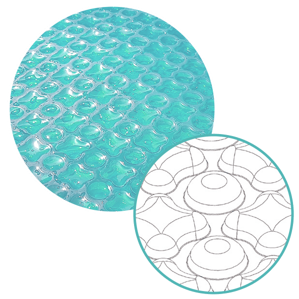Su burbujas optimiza la flotación sobre el agua gracias al contacto plano. Los intercambios térmicos son reducidos y es por ello que no hay penetración en el agua. Su aislamiento es eficaz gracias a la optimización de la superficie de las burbujas.