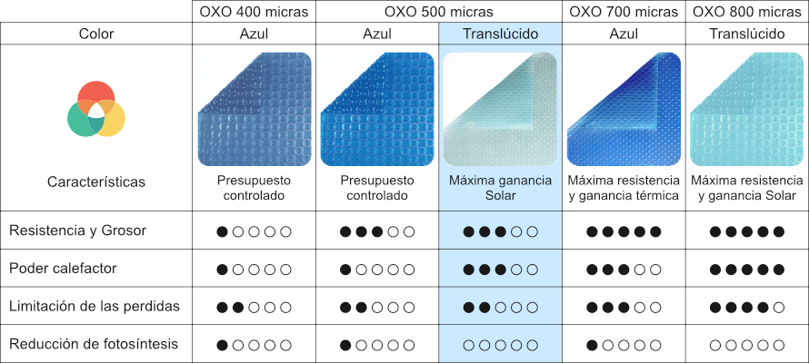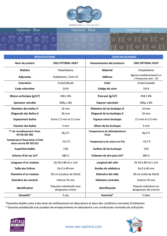 El cobertor térmico OXO Cristal tiene una densidad de material de 500 micras y está fabricado con su novedosa tecnología con burbujas de forma alterna ( redondas y en forma de X ). Este modelo de manta térmica para piscina se fabrica en Francia y está ideado para resistir durante un largo periodo de tiempo. Gracias a su forma no se dilata con el sol y por tanto permanece de uniforme lo que aumenta su tiempo estimado de vida útil.
