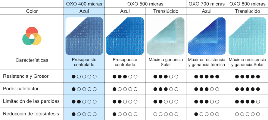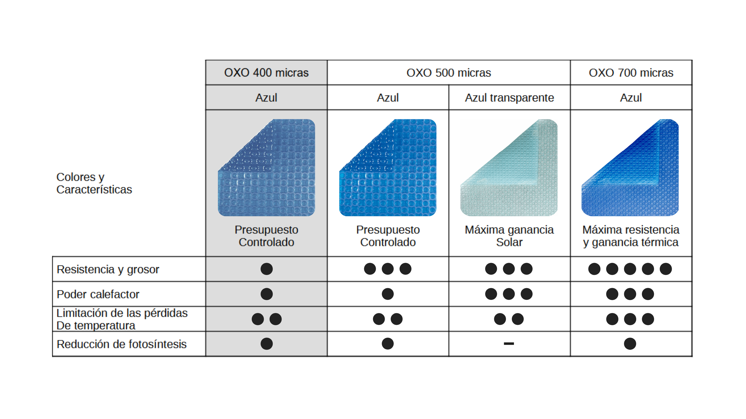 OXO es un tipo de manta térmica con una forma innovadora compuesta por dos burbujas complementarias y diseñada para resistir los rayos del sol y los tratamiento químicos en el agua de la piscina. Resiste más que la cubiertas de burbujas clásicas gracias a su grosor uniforme. Su burbuja es más gruesa y homogénea y que gracias a su forma retiene el aire en su interior para ofrecer una mayor longevidad sobre la calidad de su material.