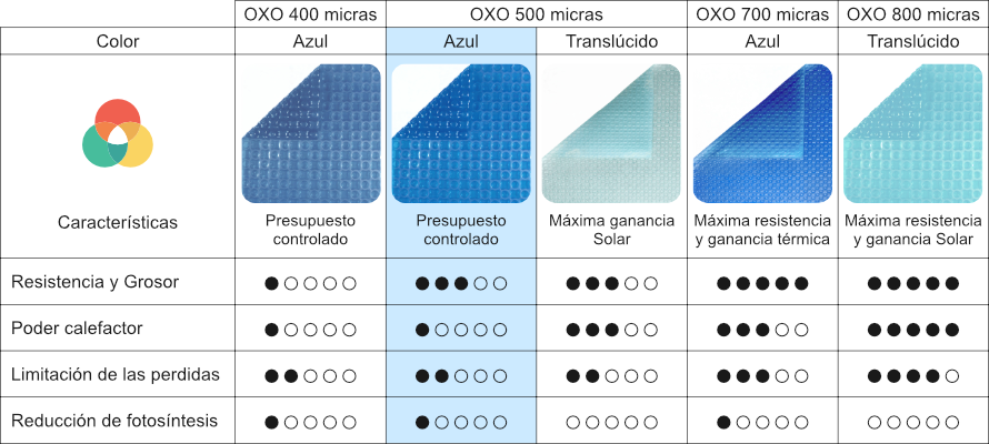 OXO es un tipo de manta térmica con una forma innovadora compuesta por dos burbujas complementarias y diseñada para resistir los rayos del sol y los tratamiento químicos en el agua de la piscina. Resiste más que la cubiertas de burbujas clásicas gracias a su grosor uniforme. Su burbuja es más gruesa y homogénea y que gracias a su forma retiene el aire en su interior para ofrecer una mayor longevidad sobre la calidad de su material.