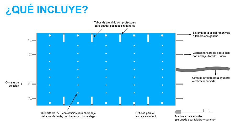 Tanto el enrollado como el desenrollado es muy simple y apenas lleva de 30/60 segundos en el desenrollado y 2/3 minutos en el enrollado/colocación. Sirve tanto para ponerla y retirarla a diario como para colocarla de forma prolongada y es ideal para piscinas que queremos climatizar. Evita además que la suciedad y los residuos puedan caer al agua y no permite que se desarrolle la fotosíntesis.