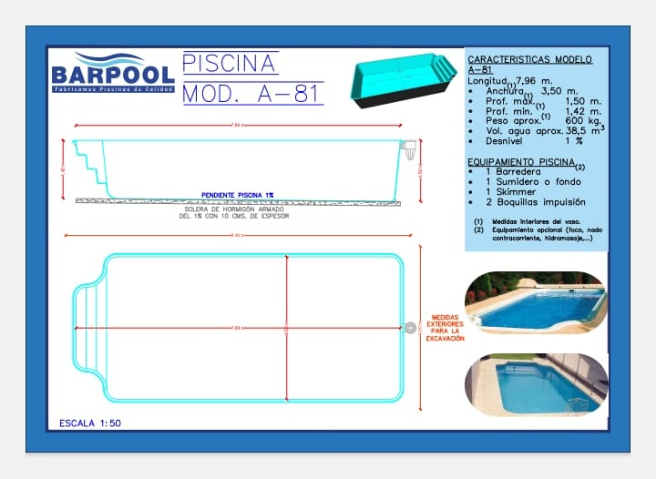 - Medidas: 7,96m x 3,50m con forma + 15cm de margen el todo el contorno