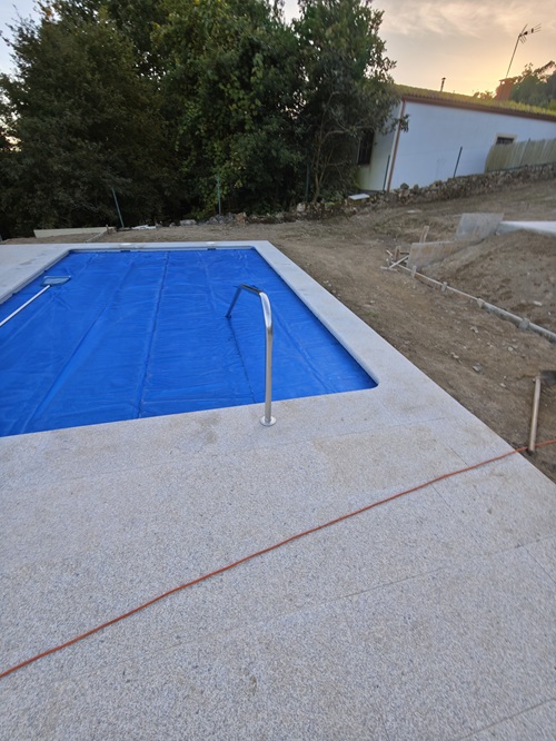 Cubierta de Invierno gris/gris de medidas crokis internas ( 5,90m x 3,90m rectangular ) +15cm de desborde perimetral ( Medidas totales de la cubierta de 6,20m x 4,20m ) + cajeado de pasamanos