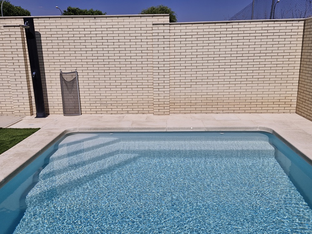 Medidas totales de piscina de: 6,00m x 4,20m ( incluido los +15cm de desborde perimetral ) con esquinas rectas a 90º grados