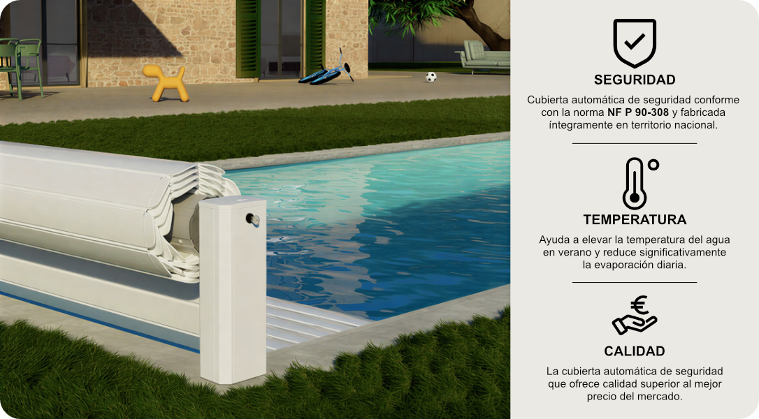 - Cubierta automática de lamas de PVC con opción a diferentes colores: Azul, Beige, (blancas de serie / otros colores consultar precio).