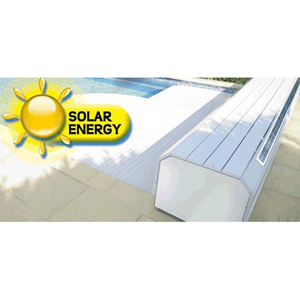 El modelo Banc Solar Energy se entrega con 2 baterías reguladas electrónicamente y alimentadas por un panel solar fotovoltaico de alto rendimiento. Incluye además un aviso sonoro advierte de la carga baja de las baterías garantizando un último ciclo completo apertura/cierre antes de agotarse del todo su energía. Tiene una autonomía de 40 ciclos (para una piscina aproximada de 8m X 4m).