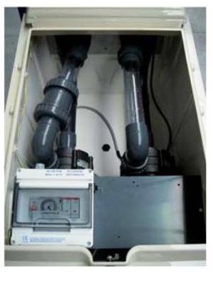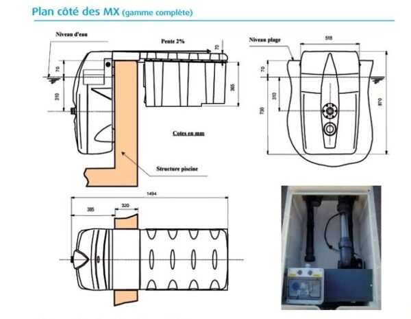 Depuradora sin obra Mx25 para piscinas de hasta 120m3 de capacidad. Este concepto de depuradora sin obra permite la filtración y depuración sin romper ni remodelar la piscina. Las tuberías se sitúan por detrás de la mochila junto con la bomba de filtración, el cuadro eléctrico y los diferentes periféricos. Esta mochila se sitúa en la parte trasera del Filtrinov MX25. Este modelo de filtración compacto es ideal para ser adaptado a cualquier tipo y forma de piscina hasta 110m3 (máximo para piscinas de 12m x 6m recomendado) .