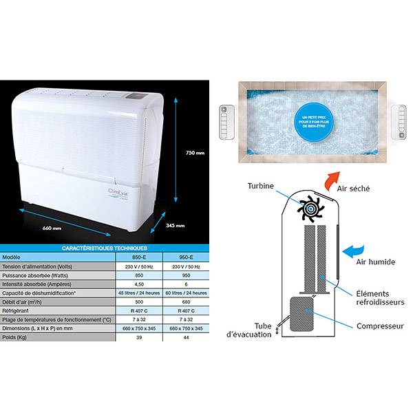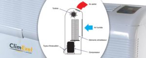 Una consola de deshumidificación es una excelente solución técnica para tratar el aire de una piscina cubierta, no obstante la implantación de una consola de deshumidificación en un lateral de la piscina podría crear una “zona muerta” en la que el ventilador del deshumidificador tendría dificultades de tratar toda la humedad. Los deshumidificadores Climexel tienen un bajo consumo eléctrico y se conectan sobre un enchufe eléctrico estándar normalizado de 230 V + T + N de 16 amperios.