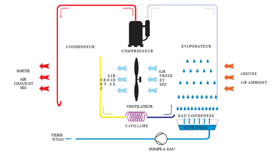 Un aparato de deshumidificación de piscinas permite transformar el aire húmedo en aire seco y caliente. El aire húmedo es aspirado por el ventilador así a un evaporador, en donde se enfriara, llevándose así la condensación del agua y su extracción mediante una evacuación (deposito o desagüe exterior). Una vez secado el aire frio se dirige hacia un condensador en el cual se calienta antes de ser reenviado al espacio del habitáculo. Finalmente este ciclo se repetirá hasta llegar a condiciones ideales.
