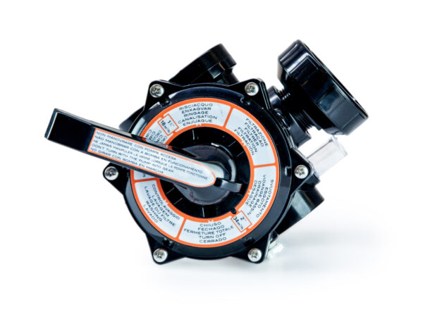 Cabezal (cabeza selectora) del filtro de arena laminado Azur de QP. Dispone de una válvula con llave selectora en el lateral de 6 vías o secciones con función de filtración, desagüe, lavado, enjuague, recirculación y cerrado. La función del filtrado es la preferente y tiene como objetivo la eliminación de residuos y agentes externos (polvo ambiental, pequeñas partículas, insectos en el agua, etc.) El lavado es otra de las funciones de la válvula selectora y se utiliza durante un tiempo máximo de 3 a 5 minutos para purgar el filtro cuando esté este sucio o colapsado. El enjuague (otra de las posiciones prioritarias) es el paso siguiente al lavado y tiene una duración máxima de 45 segundos (procede a la eliminación de la suciedad acumulada en la parte superior del filtro).