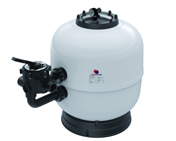 El filtro laminado Superpool TT pertenece a la familia de filtros de arena de piscinas laminados. Este modelo destaca especialmente por su resistencia y por su durabilidad. Incluye en la parte lateral la cabeza selectora con válvula de 6 vías para llevar a cabo todas las funciones en la depuración de piscinas. En su parte superior se encuentra una tapa oscura con tornillos para un cierre hermético y se adapta además un manómetro de presión para controlar el buen funcionamiento. En su base incorpora una peana de estabilización fabricada en PVC resistente que dota la filtro de mayor aplomo y evita que esté en contacto directo con el suelo del local técnico.