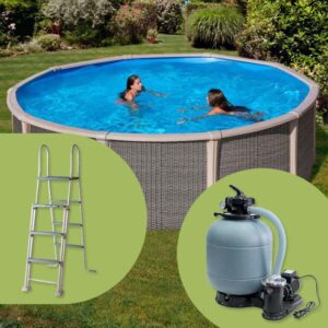 El modelo de piscina Fusion Pool circular incorpora una escalera de 3 x 3 peldaños de PVC reforzado de seguridad con una plataforma superior (impide el acceso a los menores dando la opción de retirar los peldaños de la parte exterior de la piscina). Este modelo también dispone de un sistema de depuración compacto y completo por filtro de arena (6m3/h) y bomba autocebante de filtración. Dispone de todas las tuberías, conexiones y carga filtrante de arena de silicio.