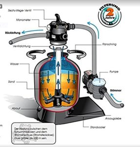 El agua se absorbe gracias a la fuerza de succión de la bomba mediante el skimer. Posteriormente es enviada al filtro pasando por la cabeza selectora de 4 o 6 vías según modelo. Las partículas más finas quedan retenidas gracias a la carga filtrante para después volver a la piscina por medio del impulsor. El manómetro situado sobre la cabeza selectora indica la presión en la cuba. Cuando la presión es superior a dos veces lo normal, se procede a realizar un contra lavado para limpiar la carga filtrante. Esta operación se efectúa invirtiendo la manilla selectora del cabezal (todos los cambios de selectora se llevan a cabo con el sistema de filtración en parado para evitar roturas).