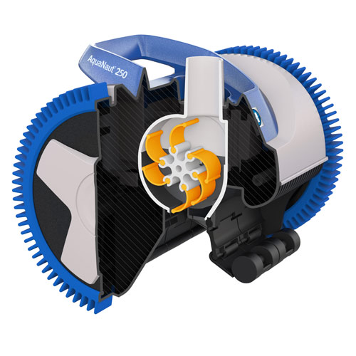 Rodea los obstáculos gracias a su gran maniobrabilidad con sus ruedas patentadas. Dispone de una turbina ajustable, patentada V-Flex, que captura los residuos de gran tamaño para una limpieza completa del vaso de la piscina. La aspiración del limpiafondos Aquanaut 250 es máxima independientemente del caudal. Dispone de 3 bocas de aspiración intercambiables con recogedor (prefiltro) de hojas incluido.