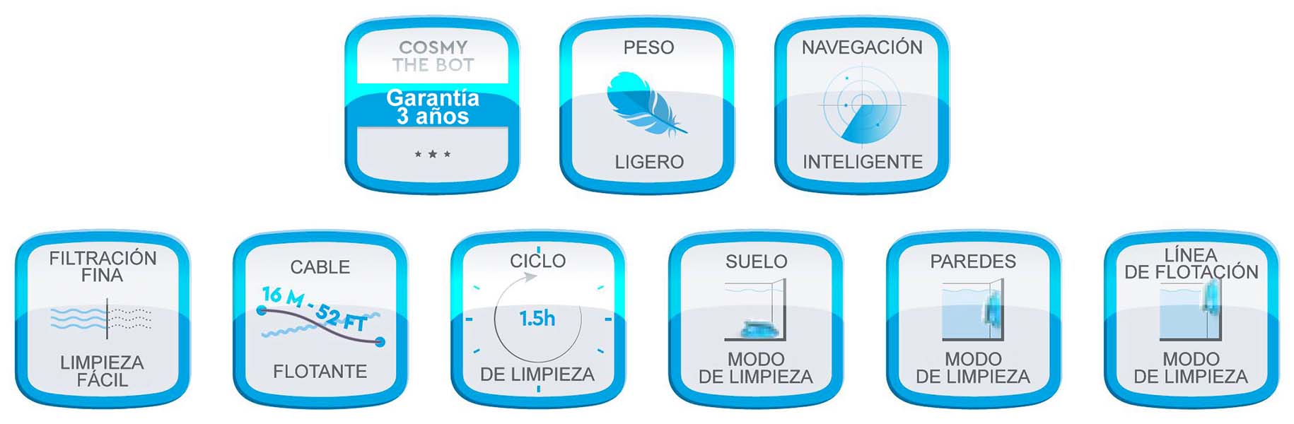 - El más estilizado del mercado: Es menos pesado que los demás limpiafondos del mercado y gracias a su sistema de drenaje rápido nos permite sacarlo de la piscina de forma más cómoda (estas son muy buenas noticias para tu espalda :). Cosmy destaca además de por sus funciones por su estética y su plasticidad, quedará espectacular en tu piscina…