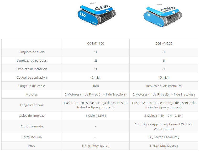El Limpiafondos COSMY 150 de BWT es fiable y preciso. Los robots de limpieza automáticos de COSMY están equipados con un sistema de propulsión que ofrece mayor eficiencia gracias a sus 2 motores de accionamiento y una potente bomba que lo convierten en uno de los más potentes del mercado. El modelo COSMY destaca por su eficacia. Es muy ágil y sobre todo ligero, con una potente capacidad de aspiración, calcula el recorrido más rápido consiguiendo un resultado final perfecto.