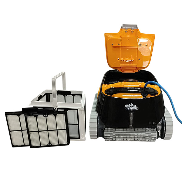 El limpiafondos Dolphin E35 dispone de 18 metros metros de cable y se recomienda para piscinas de todo tipo de hasta 12 metros de largo. Su caudal de aspiración es de 15m3/hora. Incorpora 2 motores y su ciclo de limpieza es de 2 horas. El modelo E35 incluye de serie el carrito de transporte. Es robusto, fiable muy duradero. Su funcionamiento es simple y no requiere de servicio técnico para su mantenimiento y reposición de piezas consumibles. El E35 es ideal también por la calidad de sus componentes, por su capacidad de llegar a cualquier rincón de la piscina y por una muy buena relación calidad-precio. Cabe mencionar que incluye de serie y sin coste adicional el filtro de Primavera y sobre todo el filtro ultra fino para la retención de las partículas más finas que se acaban depositando en la piscina (polen, polvo fino, arenilla…).