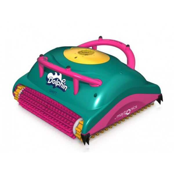 Limpiafondos automático Dolphin Swift para piscinas. Este modelo de limpiafondos eléctrico se encarga de la limpieza del fondo del vaso de la piscina así como de las pendientes y las paredes. Uno de los mejores en cuanto a su relación prestaciones/precio. El Dolphin Swift de Maytronics se recomienda para todo tipo de piscinas y para largos de hasta 10 metros. La longitud total del cable de este robot limpiafondos Dolphin llega hasta los 18m.