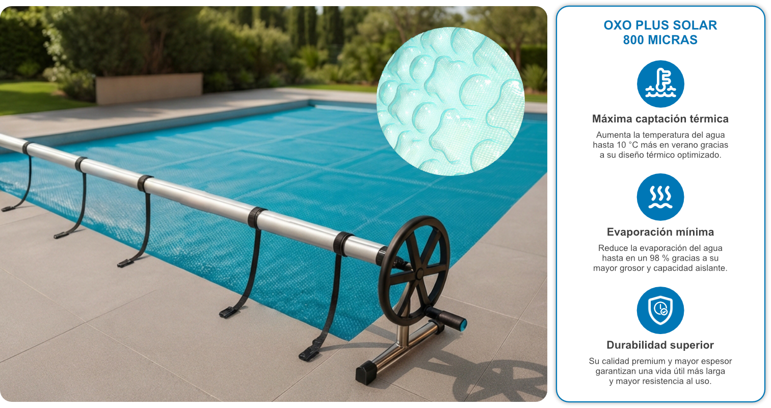 El cobertor térmico OXO Premium Solar translúcido de 800 micras está diseñado para aprovechar al máximo la energía solar y mejorar el confort de tu piscina, ofreciendo un alto rendimiento térmico y una gran durabilidad.