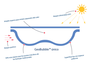 la manta térmica GeoBubble tiene una huella más grande que las burbujas tradicionales. Permite la expansión del aire dentro de la burbuja mucho más que con cualquier otra. La rígida cintura hace que la burbuja sea lo suficientemente fuerte como para retener el aire expandido y no se estira ni estalla bajo presión. Su huella actúa también como aislante, reteniendo el calor en la piscina y ayuda a que la cobertor se quede pegado al agua para que no pueda volarse con el aire.