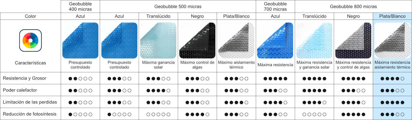 Cabe destacar que el modelo Reaguard de Geobubble dispone de una vida útil de más de 6 años según los estudios realizados y ofrece 6 años de garantía gracias a su diseño de celdas de aire patentado por Geobubble. Gracias a su tecnología y sus prestaciones nos ofrece un retorno de la inversión tanto en materiales de mantenimiento como en consumos de agua que son muy rápidos. Además este cobertor garantiza una reducción de hasta el 98% en cuanto a la evaporación del agua.