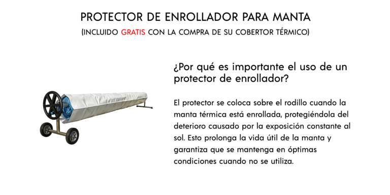 • Funda de protección de enrollador ( esta funda permite alargar en años la vida del cobertor si se emplea en Verano a diario para evitar que el sol caliente la manta cuando está enrollada y fuera del agua ( REGALO sin sobre coste por la compra del PACK )