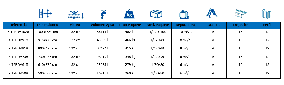 Este modelo cuenta con una pared metálica (lámina de contención) lacada en blanco. Cuenta con refuerzos laterales a 90 grados con un sistema de protección integrado sobre estos (por un lado para eliminar rozaduras y cortes así como para evitar que los menores puedan caer sobre ellos). Estos contrafuertes laterales hacen de refuerzo y contención del peso del agua y garantiza la estabilidad de la piscina. Incluye skimmer de pared completo así como de un grupo de filtración compacto (filtro de arena, bomba y carga filtrante de arena de silicio). También intengra en el Kit piscina de una escalera de PVC reforzada.