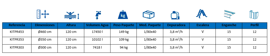 Este modelo cuenta con una lamina de acero (pared) lacada en blanco, que hace de contención del peso del agua. Cuenta con refuerzos verticales que hacen de unión y ensamblaje. Dispone en el kit piscina de escalera de PVC reforzada de seguridad y de un sistema de filtración por filtro de cartucho incorporado a la pared de la piscina (ideal para aprovechar pequeños espacios y para el mantenimiento del reborde exterior).