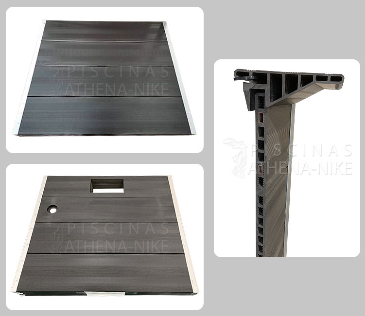 Los paneles de las piscinas de composite vienen preparados para adaptar el skimer y el impulsor de la piscina sin que se tengan que hacer perforaciones sobre la estructura. La estructura de la piscina viene con refuerzos de metal para darle mayor solidez a los paneles de la piscina (es por ello que se debe evitar taladrar para cualquier adaptación sobre las piscinas de composite).