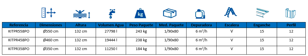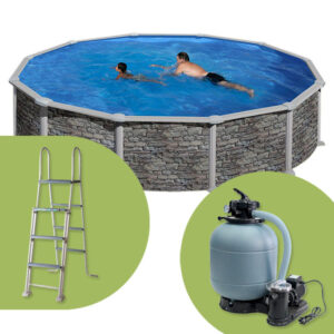La piscina Córcega circular de GRE incorpora una escalera de seguridad de 3×3 peldaños más plataforma superior. (impide el acceso a los menores dando la opción de retirar los peldaños de la parte exterior de la piscina). Este modelo también incluye un sistema de depuración completo por filtro de arena (6m3/h) y bomba autocebante de filtración. La serie Córcega al igual que toda la gama Dream Pool de GRE está equipada con los mejores componentes dotados de las mayores garantías confiriendo una total confianza y seguridad.