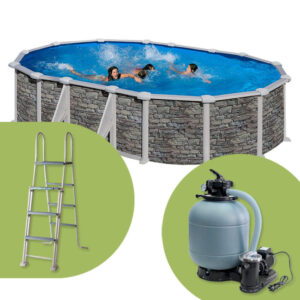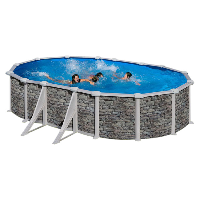 Piscina Córcega ovalada de la serie Dream Pool de GRE. Este modelo es ideal para ser adaptado a cualquier tipo y forma de jardín. Se clasifica en la serie de piscinas de acero elevadas con imitación piedra e incluye todos los componentes para su uso y funcionamiento. Se caracteriza por sus contrafuertes laterales a 90 grados y dispone de 3 tamaños diferentes: 500cm x 300cm, 610cm x 375cm y 730cm x 375cm. Incluye toda la perfilería de acero con embellecedores tanto superiores como en la base/suelo y los protectores de PVC inyectados.