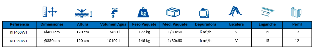 Este modelo de piscina de acero elevado cuenta con una lamina de acero (pared) que hace de contención del peso del agua. Cuenta con refuerzos verticales que hacen de unión y ensamblaje. Dispone en el kit piscina de un sistema de filtración por depuradora de arena y kit de tuberías para la conexión de la misma a la piscina (skimmer y toma de impulsión).