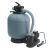 El modelo Pacific Plus ovalado de acero incorpora un revestimiento liner con tratamiento anti U.V. de color azul de 50/100 de grosor ( máxima calidad ) así como de skimmer cuadrado de pared, depuradora completa por filtro de arena grande ( 6m3/h en sus 3 versiones ) y bomba autoaspirante potente de GRE (0,50hP) con carga filtrante de arena de silicio incluida y tuberías flexibles de conexión. Dispone de una escalera de seguridad con plataforma superior y un sistema contra el ahogamiento de menores (peldaños desmontables).