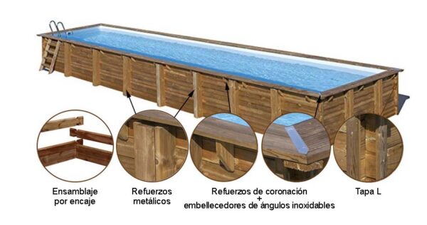 El modelo Cardamon de Gre es una piscina que destaca por sus grandes dimensiones, es perfecta para la natación y el uso entre numerosos bañistas ideada para los amantes de la piscina de madera grande. Esta piscina de madera puede instalarse en modo elevada, semi enterrada o totalmente enterrada. Su estética y sus acabados así como su tamaño hacen de este modelo una piscina singular.
