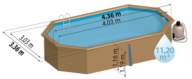 La piscina de madera GRE Sunbay Grenade tiene unas medidas de 4,36 metros de largo x 3,36 metros de ancho x 1,19 metros de altura. Ideal por su forma alargada se adapta muy bien a todo tipo de espacios exteriores. Incluye refuerzos con anclajes muy fáciles de colocar que se atornillan al suelo (losa de hormigón) para darle mayor firmeza a la estructura. La Grenade pertenece a la sección de piscinas octogonales ovaladas de madera de la marca GRE y aporta todos los elementos para disfrutar de una experiencia plena con toda la familia. Destaca por su estética y acabados, por la calidad de sus componentes, su aspecto robusto y sobre todo por su durabilidad.
