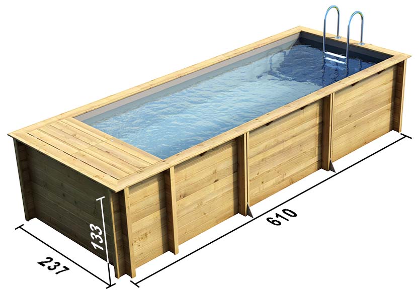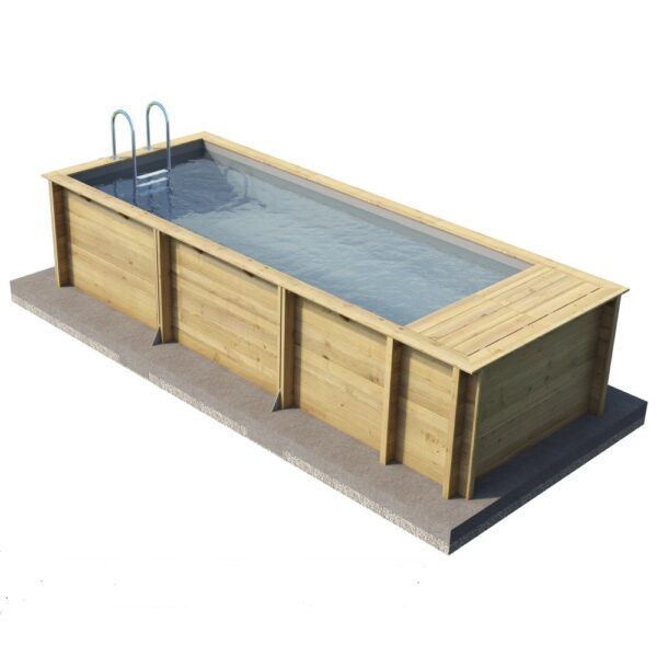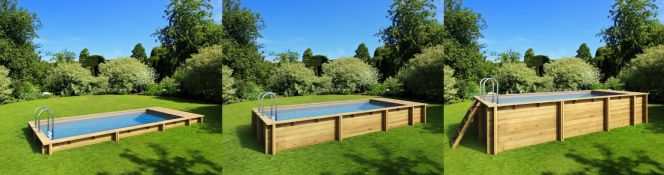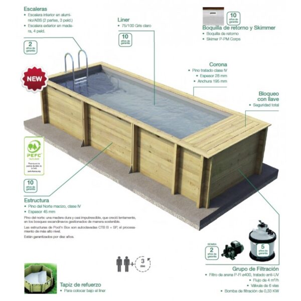 La piscina de madera Pool’n Box es una de las mayores referencia de la marca BWT. Destaca por su forma alargada (rectangular) y por incorporar una caseta de madera que prolonga la piscina. Gracias a este local técnico se puede albergar el sistema de filtración así como todo el material de la piscina (producto químico, complementos, juegos para la piscina…).